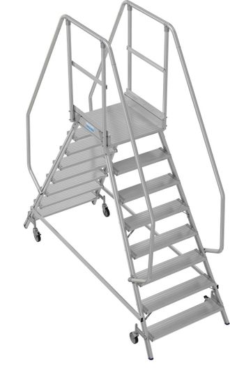 - Мобильная алюминиевая лестница с двухсторонним доступом, с противоскользящими ступенями глубиной 175 мм и большой платформой с ограждением для безопасной и удобной работы.