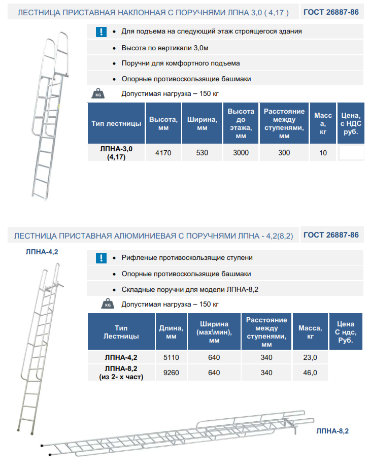 Приставная алюминиевая лестница ЛПНА полностью соответствует требованиям ГОСТ 26887-86.