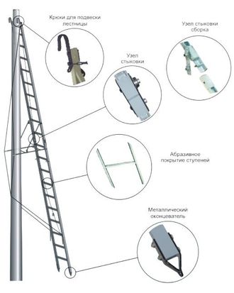 - системой страховки от падения с высоты, в виде капронового каната, крепящийся к проушине на вершине лестницы с тормозным механизмом эксцентрикового типа, к которому пристегивается строп от страховочного пояса работающего. Лестница монтируется с уже установленной системой страховки от падения с высоты;