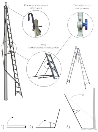 - системой приведения и удержания лестницы на опоре, представляющей собой два стропа, с помощью которых лестница приводится к опоре и фиксируется в рабочем положении;