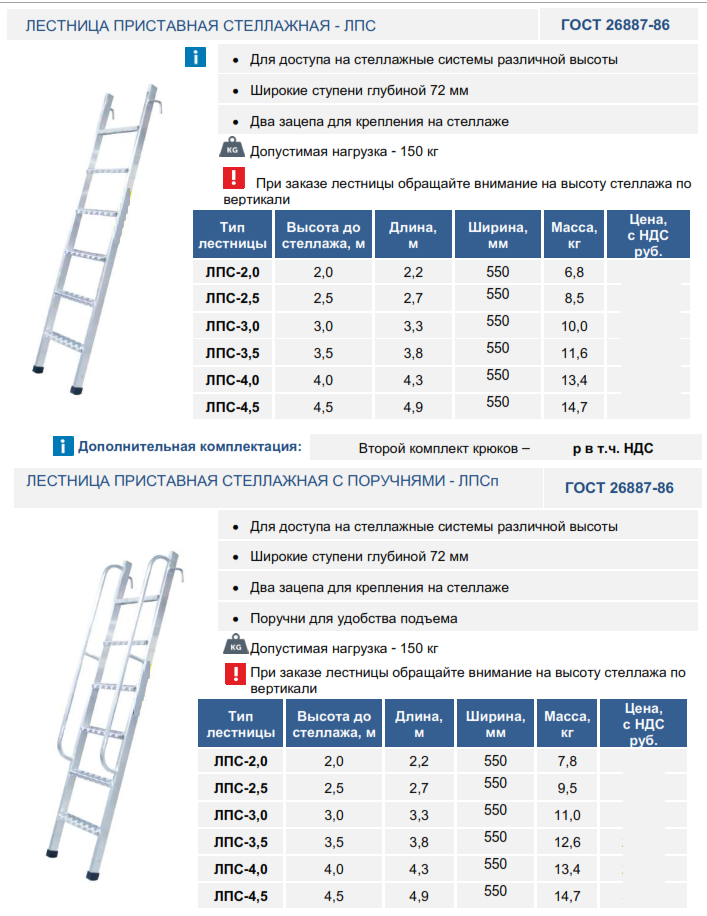 Приставная стеллажная лестница ЛПС - алюминиевая сварная лестница, шириной 550 мм, высотой от 2,0 до 5,5 метров, с широкими ступенями 72 мм, в комплекте с двумя крюками, для удобства использования на различных стеллажных системах. Дополнительно может быть оборудована поручнями. Производство ООО СФЕРА (ПК-Сервис).