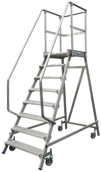 Односторонняя передвижная лестница с платформой профессиональной серии СТАБИЛО, производство фирмы Краузе - легкая передвижная конструкция из алюминиевых профилей высокой прочности. Небольшая ширина лестниц, идеально подходит для работы на складах и в торговых залах, вдоль стеллажей и других объектов, где важно, как можно ближе поместить работающего, к месту выполнения работ. Размеры площадки: 600 х 700 мм, из рифленого алюминиевого листа, достаточны для ведения безопасной работы. Трехсторонние перила платформы из круглой трубы диаметром 40 мм и высотой 1000 мм, со встроенной защитной планкой в районе колен, отвечают всем нормам безопасности. Геометрически цельные перила, плотно прилегающие стыки между поручнями подъема и перилами платформы повышают уровень безопасности и комфорта. Самостопорящиеся, подпружиненные ролики, Ø 125 мм, два из которых оснащены фиксаторами, идеальны для перемещения и стоянки лестницы с платформой в пределах рабочей зоны. Легкий монтаж без специального инструмента, плюс, поставка в виде предварительно собранных узлов, сокращает время подготовки платформ KRAUSE к работе.