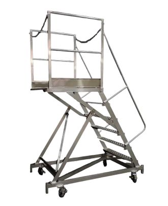 Стремянка передвижная алюминиевая представляет собой сварную конструкцию из алюминиевых сплавов с перфорированным настилом площадки и ступеней. Лестница обладает собственной устойчивостью в рабочем положении и не требует их крепления к несущим конструкциям зданий или сооружений. Лестница перемещается вдоль фронта работ на колесных опорах. Стойки изготовлены из алюминиевого профиля, имеющего в поперечном сечении форму прямоугольника. Стремянка снабжена 4-мя колесами для перемещения и фиксации в определенном положении и 4-мя винтовыми опорами для большей устойчивости конструкции. Площадка с ограждением по бокам предназначена для удобства и безопасности ведения работ на высоте и образования рабочего места непосредственно в зоне производства работ.