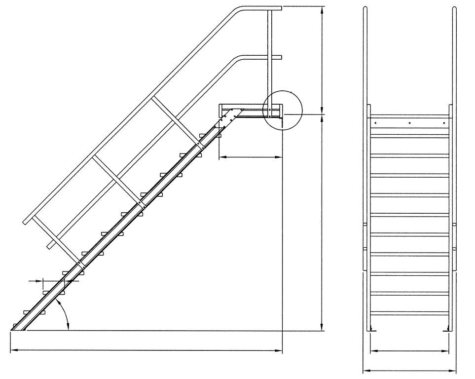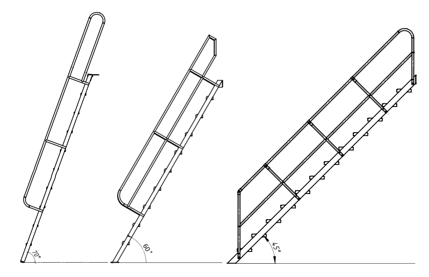 • Рекомендация по EN ISO 14122: для обеспечения безопасности предпочтительнее использовать трапы с углом наклона 45°. Трапы с углом наклона 60° применяются только в тех случаях, когда местные условия не позволяют применять другиелестницы