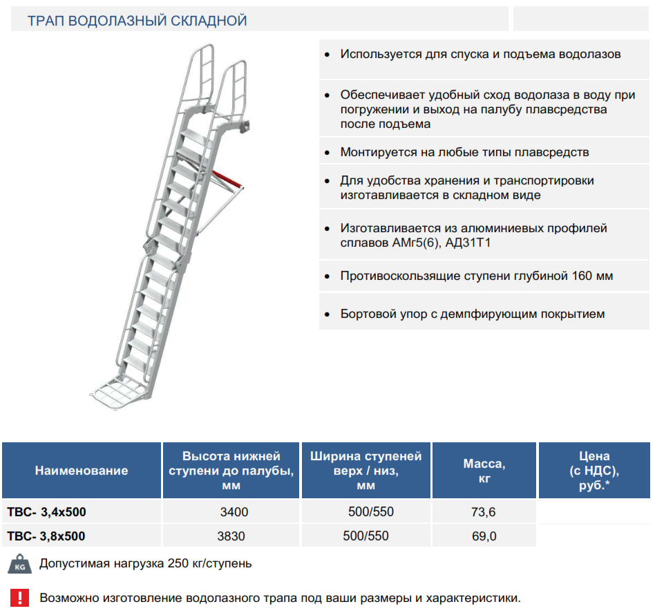 | ТИП | Высота от нижней ступени до палубы, мм | Масса, кг | Ширина ступени, мм | Стоимость, руб |