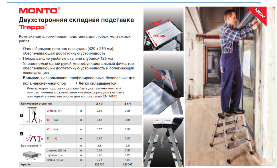 • Подставка Krause TREPPO легко и быстро складывается и раскладывается, оснащена надежным фиксатором, который предотвращает самопроизвольное складывание и управляется одной рукой