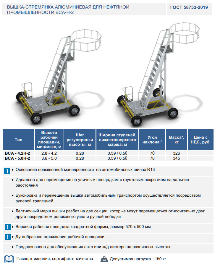 Вышка-стремянка алюминиевая для нефтяной промышленности ВСА-Н-2 С увеличенной базой-основанием повышенной маневренности на автомобильных шинах R13. Предназначена для обслуживания авто и / или жд цистерн на разных высотах. Подходит для работ с контейнерами и иным оборудованием в пределах указанных высот. Материал – алюминий. ИСКРОБЕЗОПАСНА.
