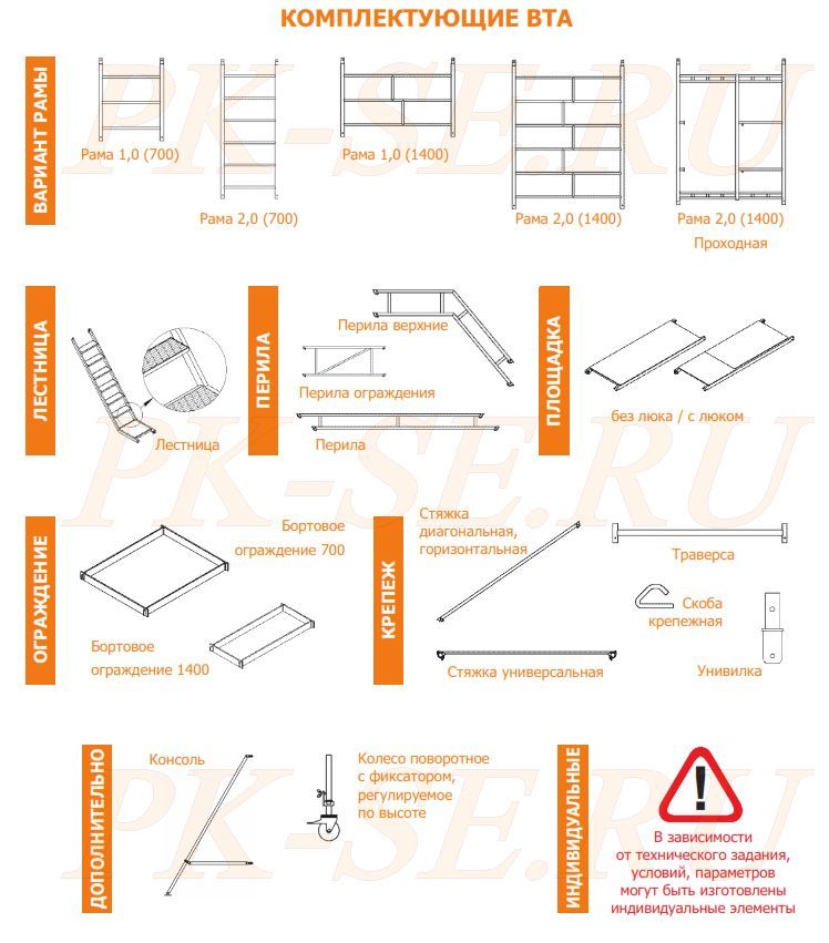 - Вышки с высотой настила от 5 м и более укомплектованы треугольными консолями (4 шт.) для обеспечения устойчивости за счёт увеличения площади опоры.