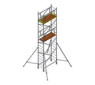 Компактная при хранении, передвижная, быстроразборная, алюминиевая вышка-тура применяется в строительстве, во время проведения монтажных, отделочных или ремонтных работ, для обслуживания техники и оборудования. Подходит для работы вне помещения, на открытых площадках и не требует специального ухода. Конструкция вышки состоит из стандартных секций, надстраиваемых одна на другую и усиленных диагональными распорками, обеспечивающих дополнительную жесткость вышки. Высота секций 1,0 или 2,0 метра, что позволяет собирать вышки с шагом габаритной высоты в 1,0 метр. Крепление распорок и настила -замковое. Настил площадки выполнен из фанеры с не скользящим покрытием, защищенной от влаги, заключенной в алюминиевую раму. Шаг изменения высоты площадки 0,33 м. Все вышки оборудованы поворотными колесами с фиксаторами ø 125 мм и винтовыми опорами, для компенсации наклонной или неровной поверхности.