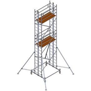 • Начиная с высоты семь метров в комплекте поставки идут 4 выносных телескопических аутригера используемые для увеличения площади опоры, повышения устойчивости вышки