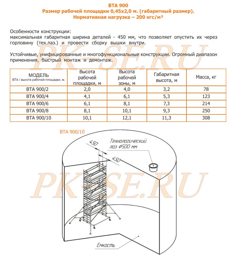 • Максимальные размер одной из сторон элементов вышки вта 900 – 450 мм, что позволяет опустить их через горловину и произвести сборку вышки внутри бака, резервуара, цистерны, емкости и другого оборудования